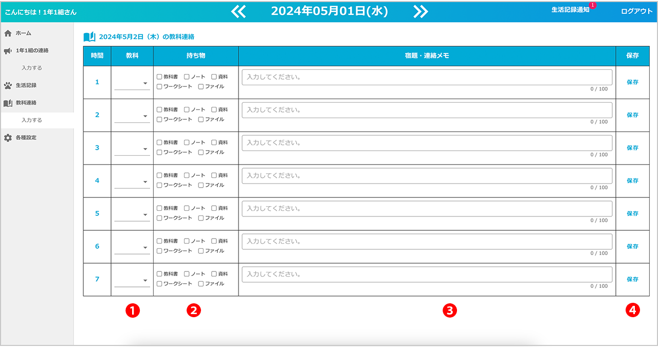 入力内容した内容を保存し、対象のクラス全員と先生に送信します。